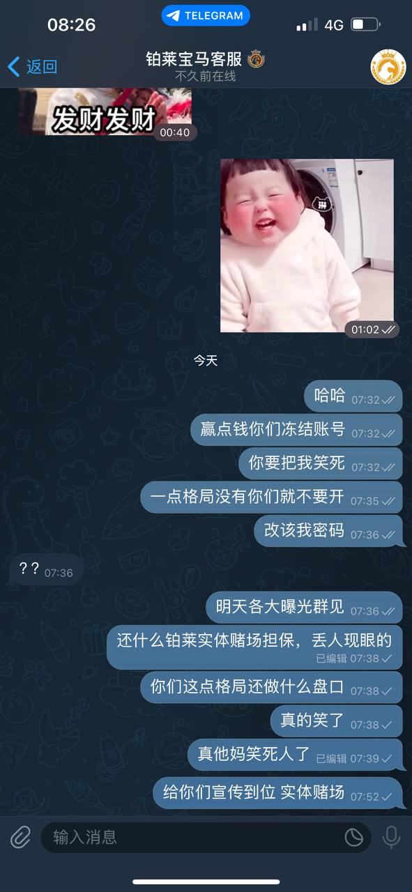 还在玩铂莱宝马娱乐大家不要玩了,开始黑款了,说什么铂莱实体赌场担保,冲200玩电子爆了,提现直接改你的汇旺账号,我看半天没账,刚去问客服账号密码都改了进不去,大家不要在玩了,就他的纯诈骗台,亏了能一直玩,赚一点马上各种搞你不能提现,大家小心!!!